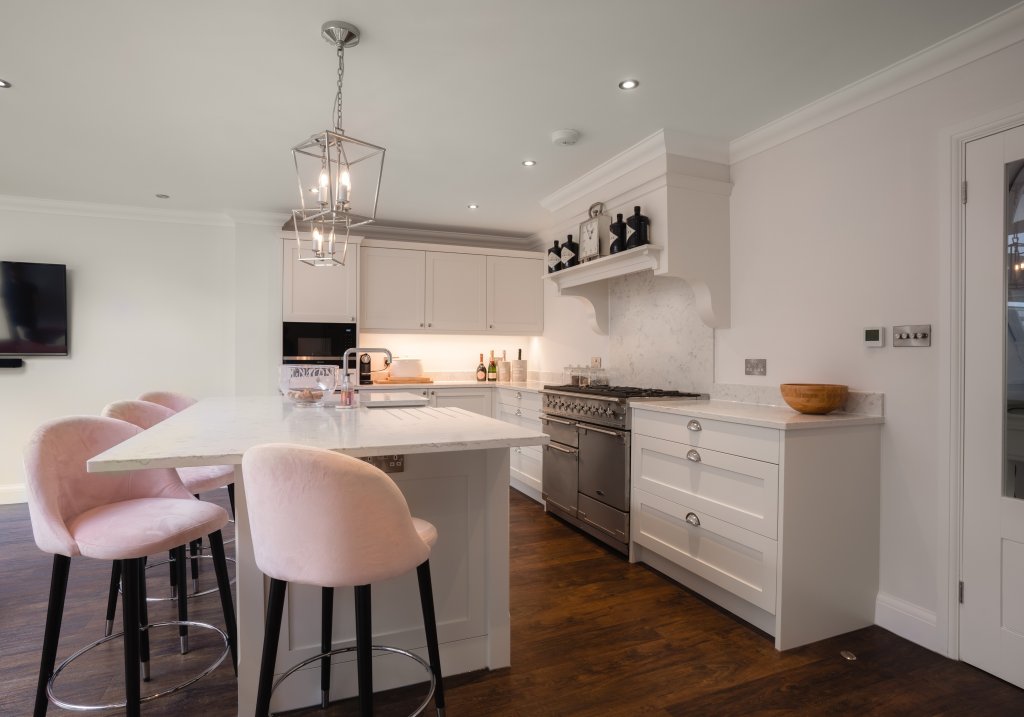 This magnificent kitchen makes a glamorous centrepiece to impress guests. At the heart of the space sits an elaborate bespoke mantel. This showstopping feature brings a regal presence to the room. A pair of silver ceiling lanterns and a vintage carriage clock continue the theme. The all-white colour palette brings the space right up to date, introducing a touch of femininity and style. Plush velvet bar stools and marble worktops contribute to the luxurious design, while a dark wood floor adds vital warmth. This extravagant interior offers a modern luxe take on tradition.