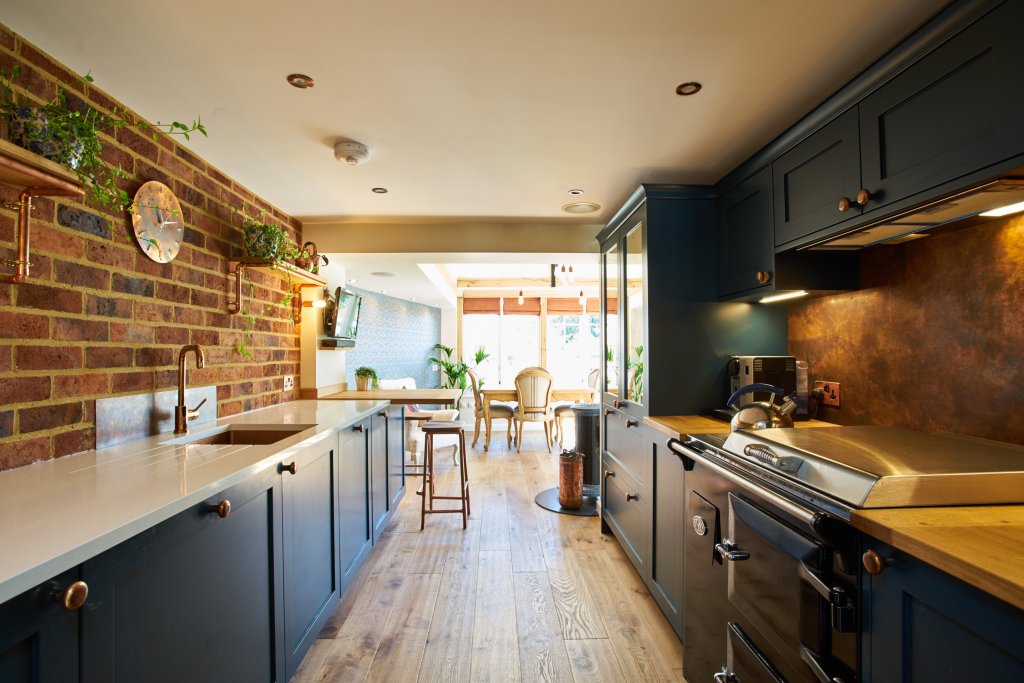 As we associate shaker kitchens with wholesome country settings, they naturally evoke cosy character. We’ve chosen to really accentuate these qualities in the beautiful period property below. A dark painted finish and soft lighting establish a warm nostalgic atmosphere. Textural exposed brick and oxidised copper with similarly warm undertones add a rustic edge. Homely timber worktops and a lovely old range cooker complete the charming space. Though this kitchen transports us to a quaint country cottage, there’s something subtly chic and contemporary about the industrial brick and copper accents.
