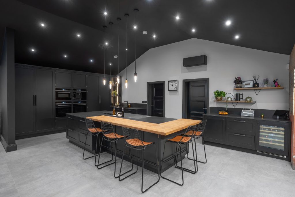 At the other end of the spectrum, this extraordinary space couldn’t be more modern. An intense black hue envelops the room establishing opulent drama. Contemporary handleless units would have been the obvious accompaniment to this innovative design. However, the subtle detailing of a shaker style unquestionably elevates the lavish atmosphere. Slim black knurled handles from Buster + Punch add a modern yet luxurious edge. This showstopping, unconventional interior is both contemporary and timeless.