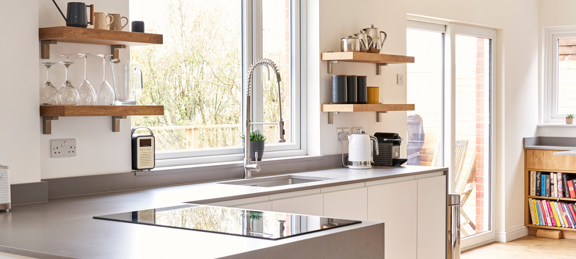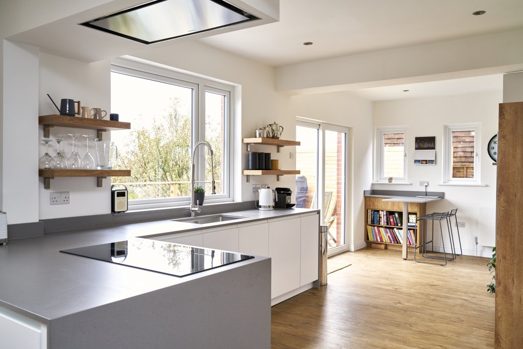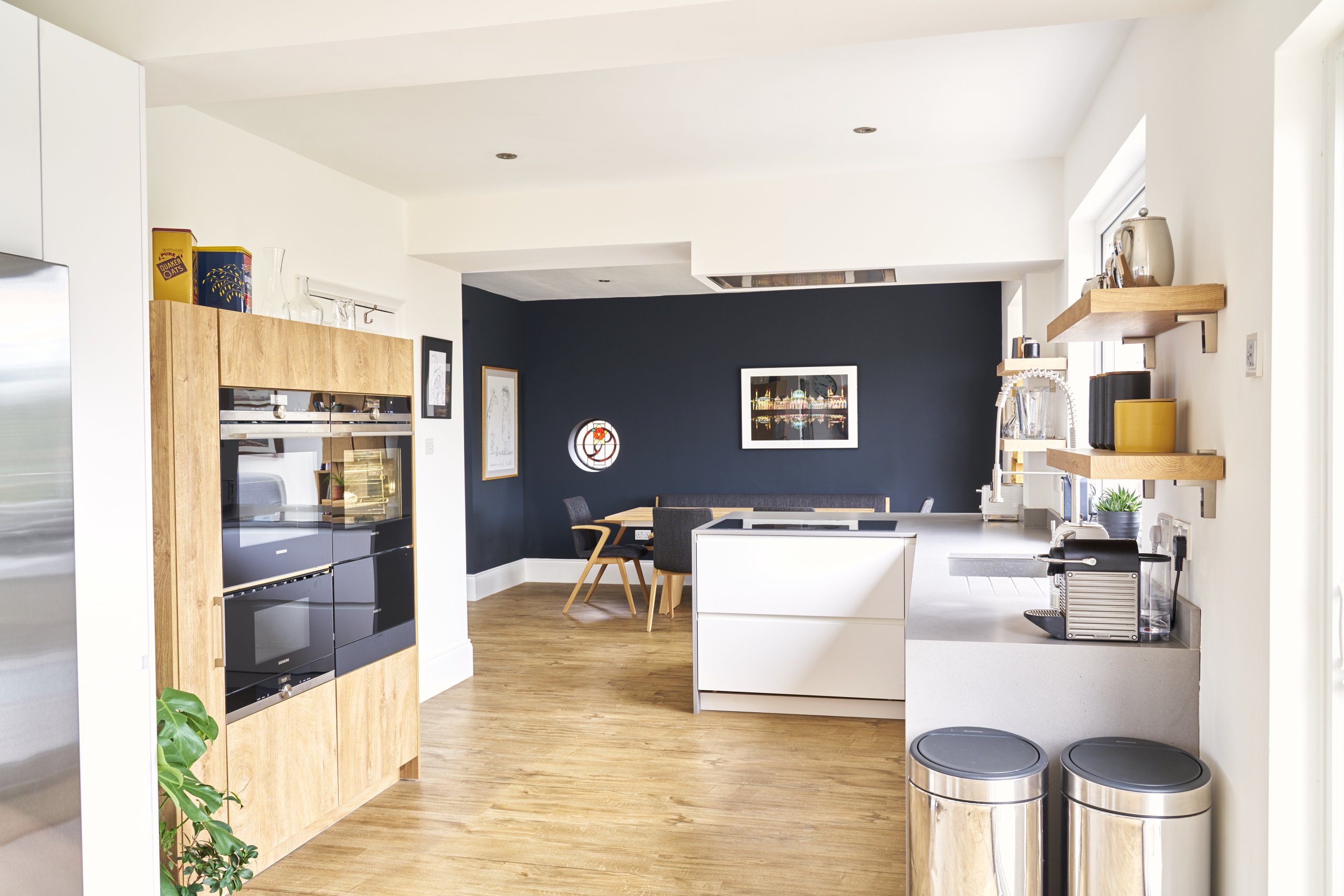 In designing this contemporary kitchen, the super matt cream doors from Rempp Küchen were chosen for their sleek appearance and fingerprint-resistant surface, which provides a clean and polished look. To enhance warmth, timber accents were thoughtfully incorporated in the oven housing and floating shelves, harmonising with the timber flooring to create a cohesive, inviting atmosphere. The rich blue wall in the dining area adds a touch of coziness, setting apart the space for meals and making it feel intimate and welcoming. This combination of textures and tones achieves a modern, yet warm aesthetic perfect for the homeowners’ style.