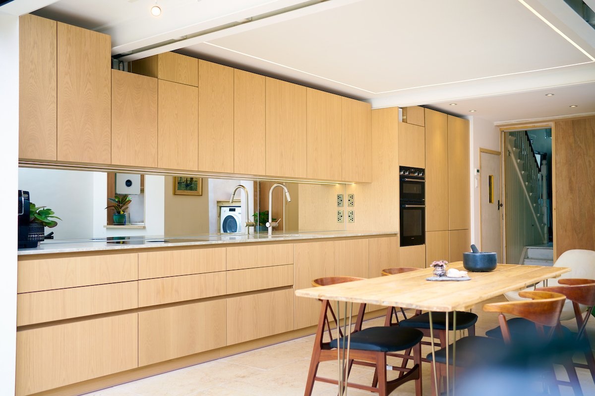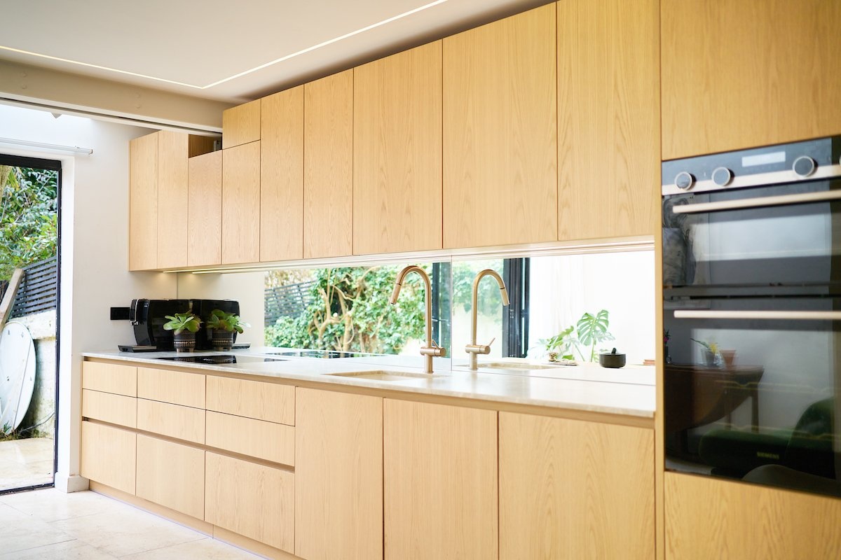 To bring their vision to life, our design team created a bespoke contemporary kitchen using natural oak cabinetry with discreet integrated handles to maintain a clean, minimalist aesthetic. A mirror splashback was introduced to reflect the garden and bring a sense of depth and light into the space. The warm timber tones were balanced with a neutral stone floor and subtle LED lighting. Large sliding doors open directly onto the garden, perfectly blending indoor and outdoor living.