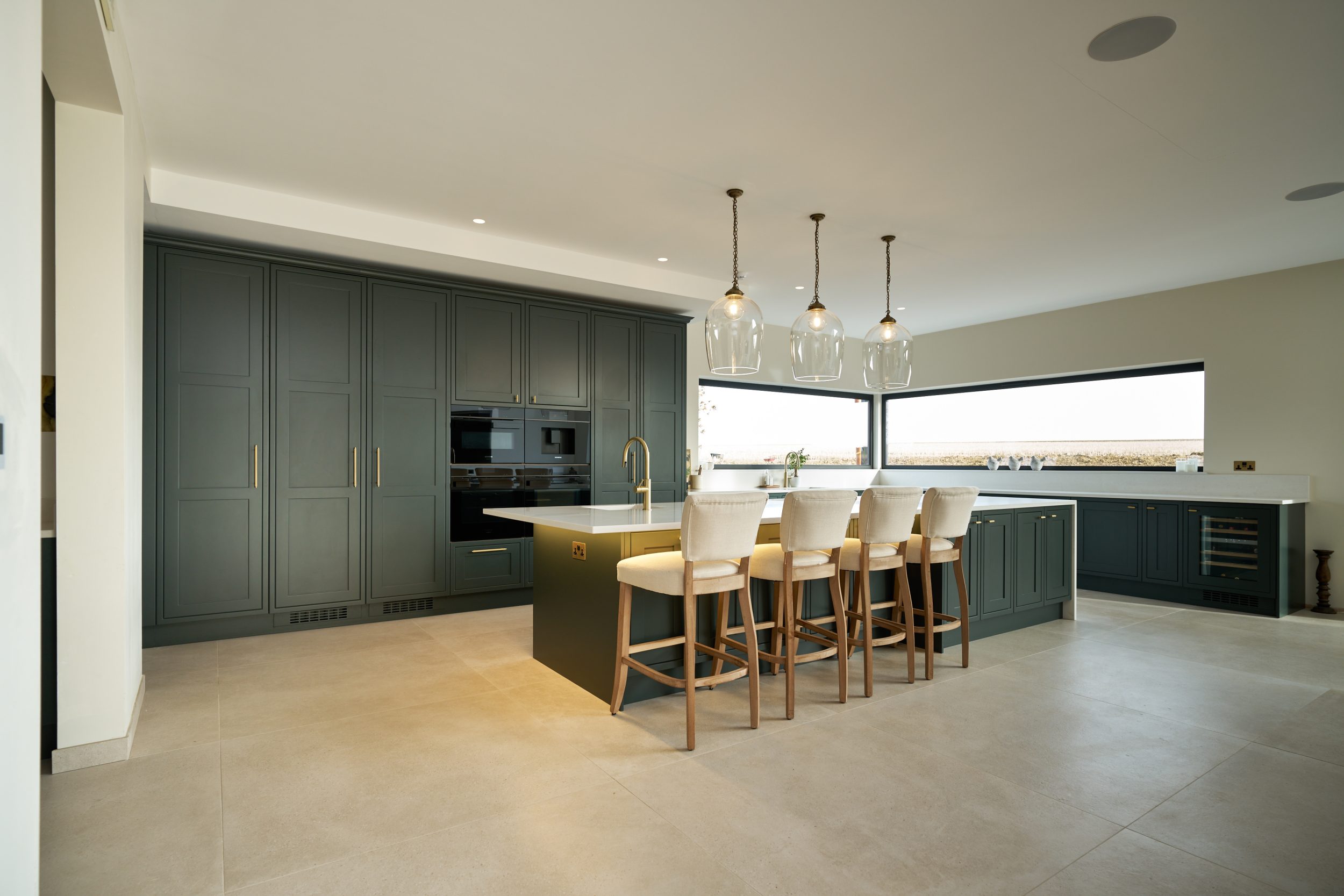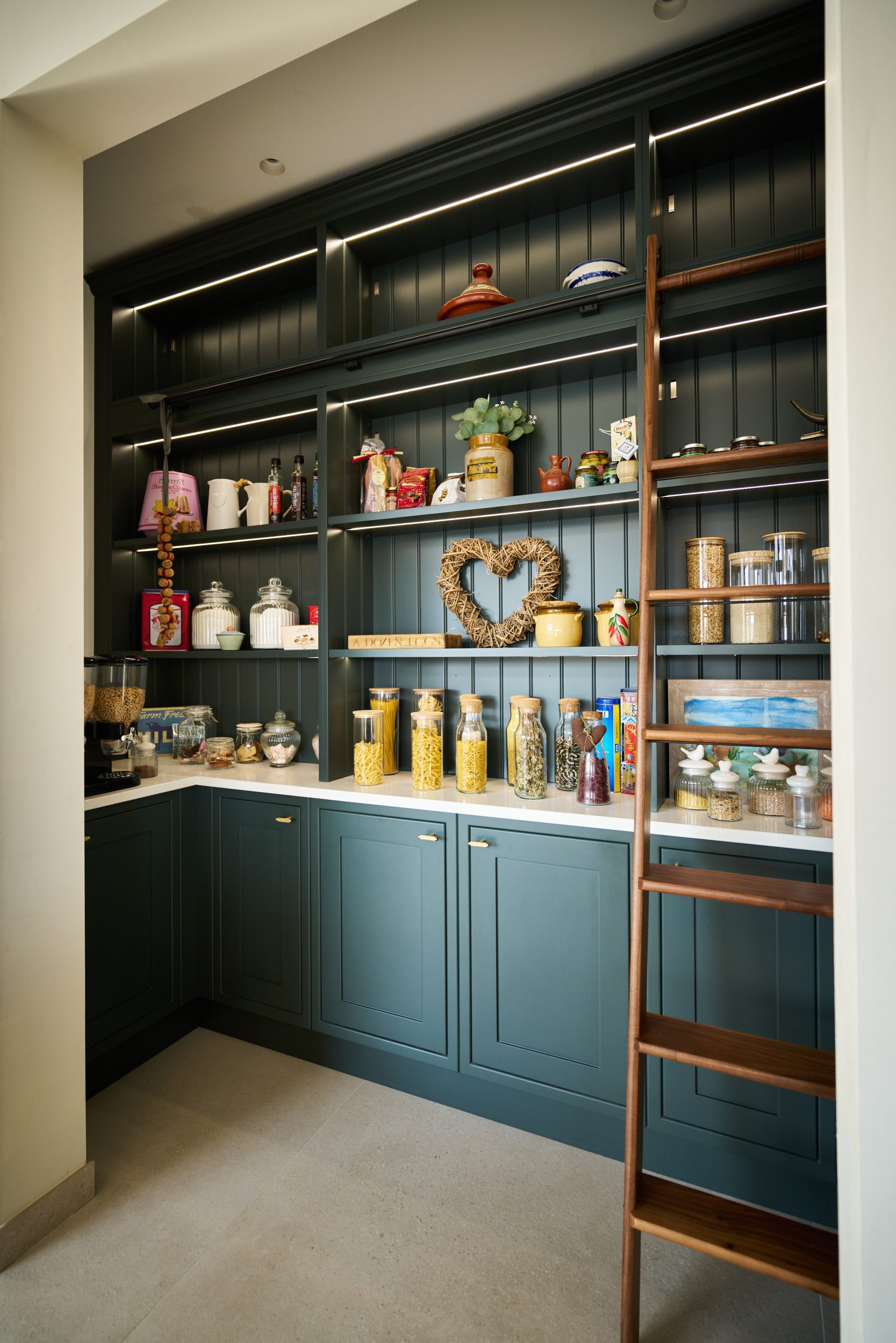 The goal was to achieve a neutral yet sophisticated colour palette, with subtle textures adding depth to the contemporary design. The Farrow & Ball painted Shaker cabinetry in Studio Green brings a rich, understated elegance, while the Waterfall Effect Quartz worktops provide a seamless, polished finish. Matte finishes across the cabinetry and countertops enhance the sleek look, complemented beautifully by brushed brass handles that add a touch of warmth and refinement. The bespoke walnut sliding ladder not only boosts the functionality of the space, allowing easy access to upper storage, but also introduces a unique, stylish detail that perfectly aligns with the high-end finishes. The result is a kitchen that feels luxurious and meticulously tailored to Tom’s vision.