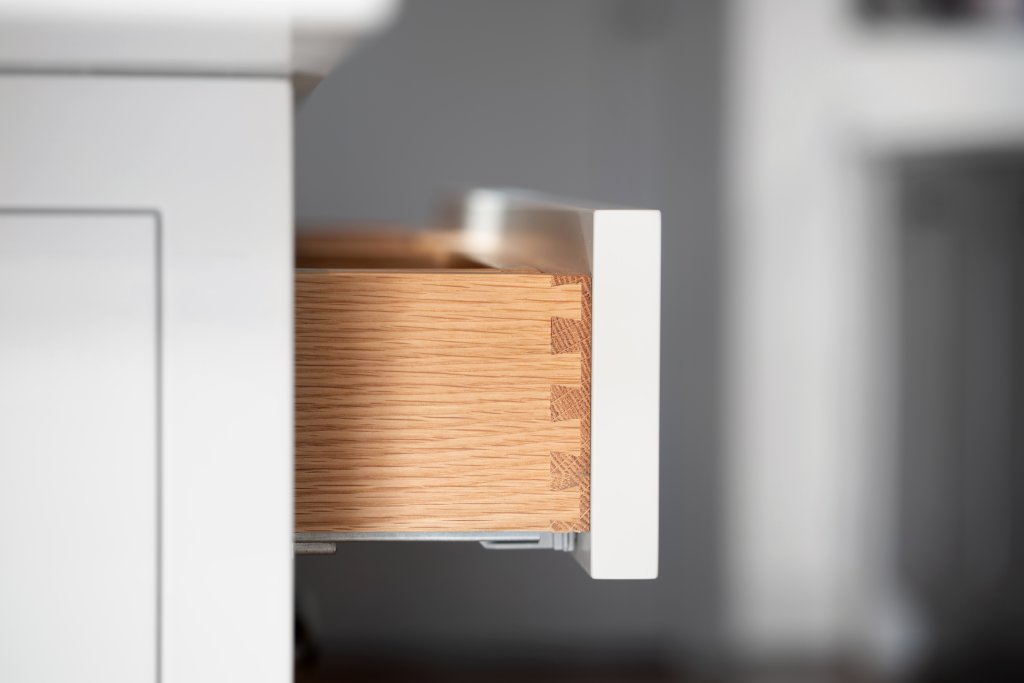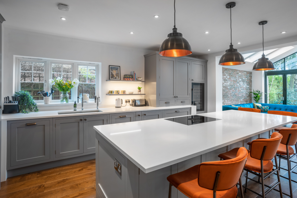 This Mylands-painted in-frame kitchen perfectly captures the client’s vision for a timeless yet striking space, blending classic elegance with a modern edge. The Blanco Zeus quartz worktops add a sleek, polished surface that enhances the minimalist design, while the warm, ambient lighting creates an inviting atmosphere, bringing a sense of warmth to the cool tones of the cabinetry. A large central island, topped with quartz and surrounded by plush suede bar stools, serves as the focal point of the room. Vibrant, hand-picked accessories introduce pops of color that contrast beautifully with the neutral palette, adding character and personality without overwhelming the space. This design achieves the perfect balance of style and practicality.