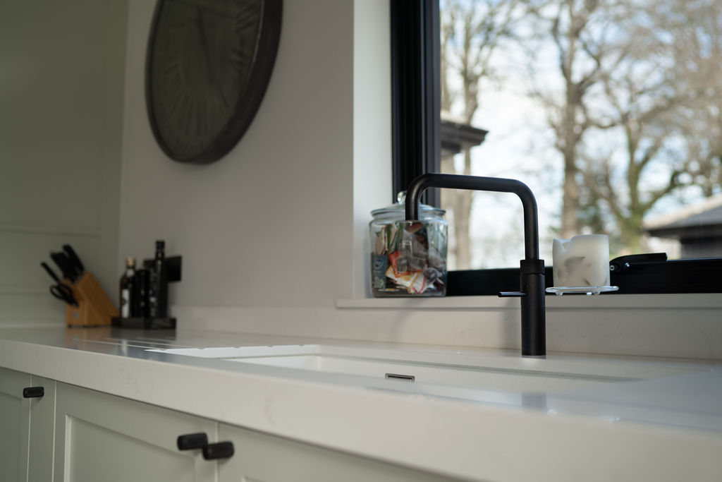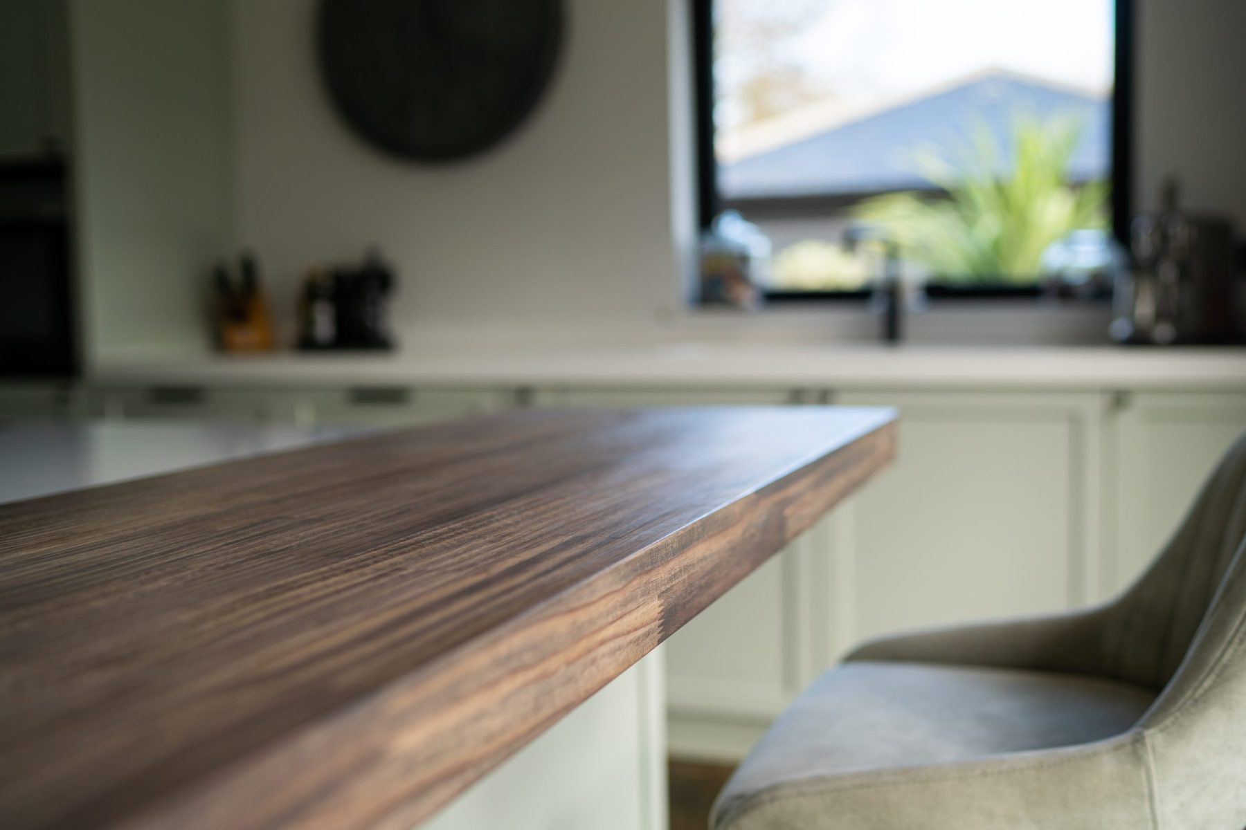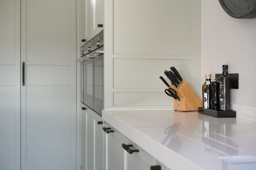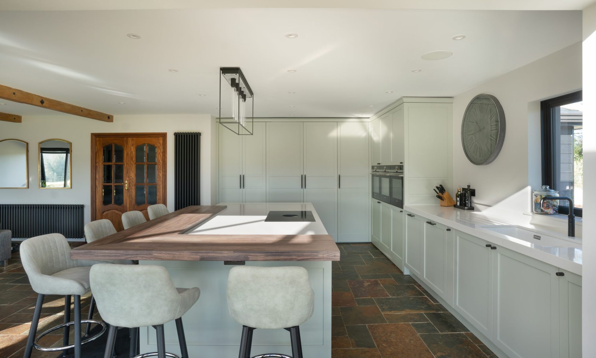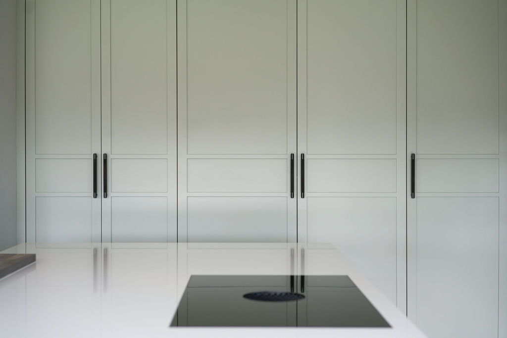 This bespoke Shaker kitchen combines classic style with modern practicality. The muted green cabinetry sets a calming tone, centered around a spacious island topped with quartz and featuring a sleek Bora induction hob with integrated downdraft extraction. Hidden behind matching cabinet doors, a discreet pantry provides ample storage while maintaining the streamlined look. A Quooker tap adds convenience with instant boiling water, while rich wood accents bring warmth, creating an inviting and highly functional space tailored to Amy’s vision.