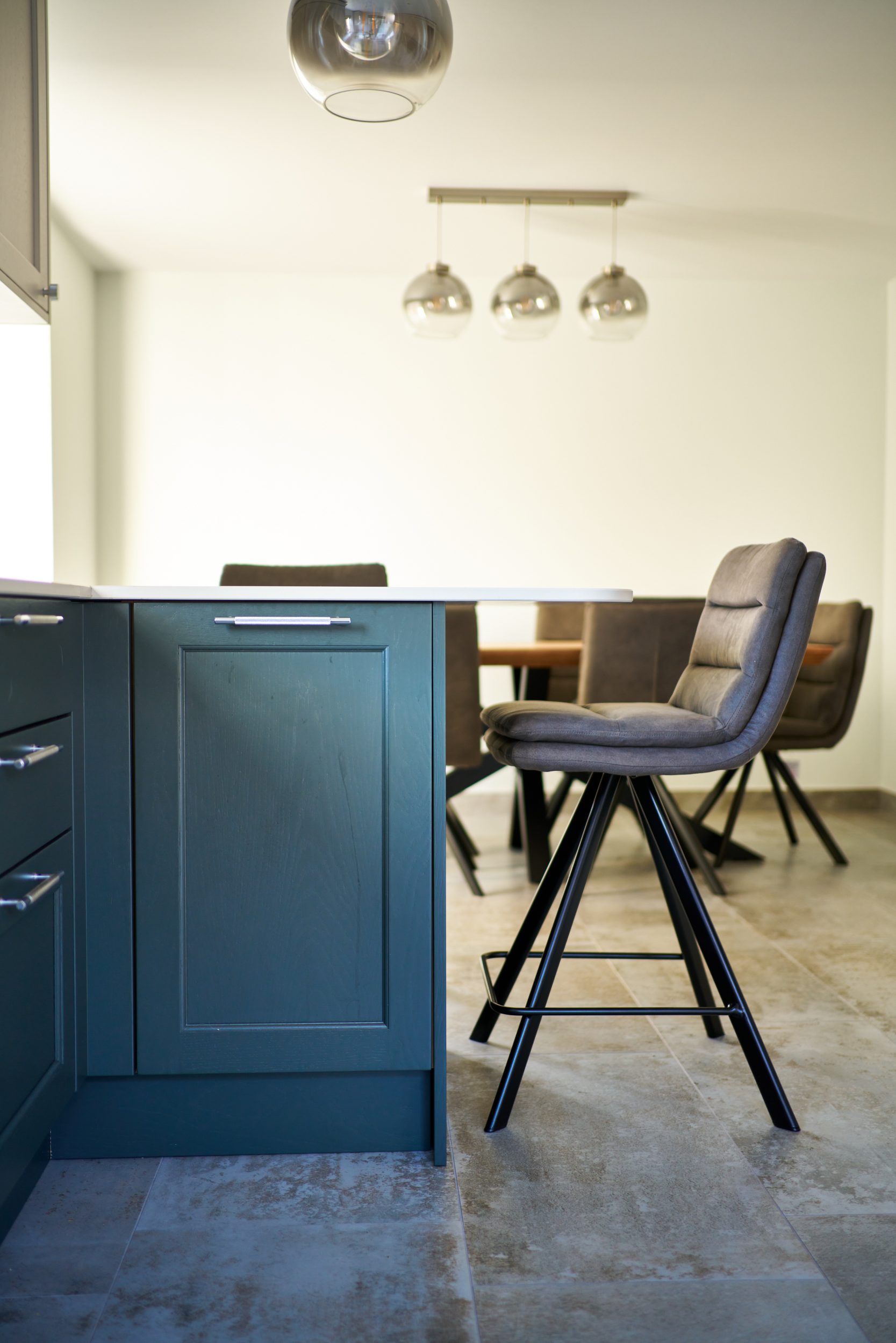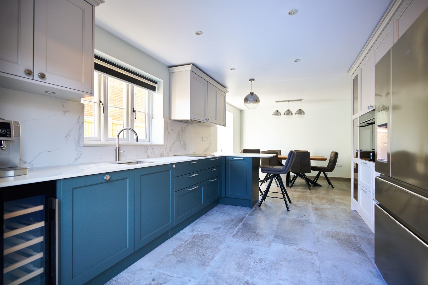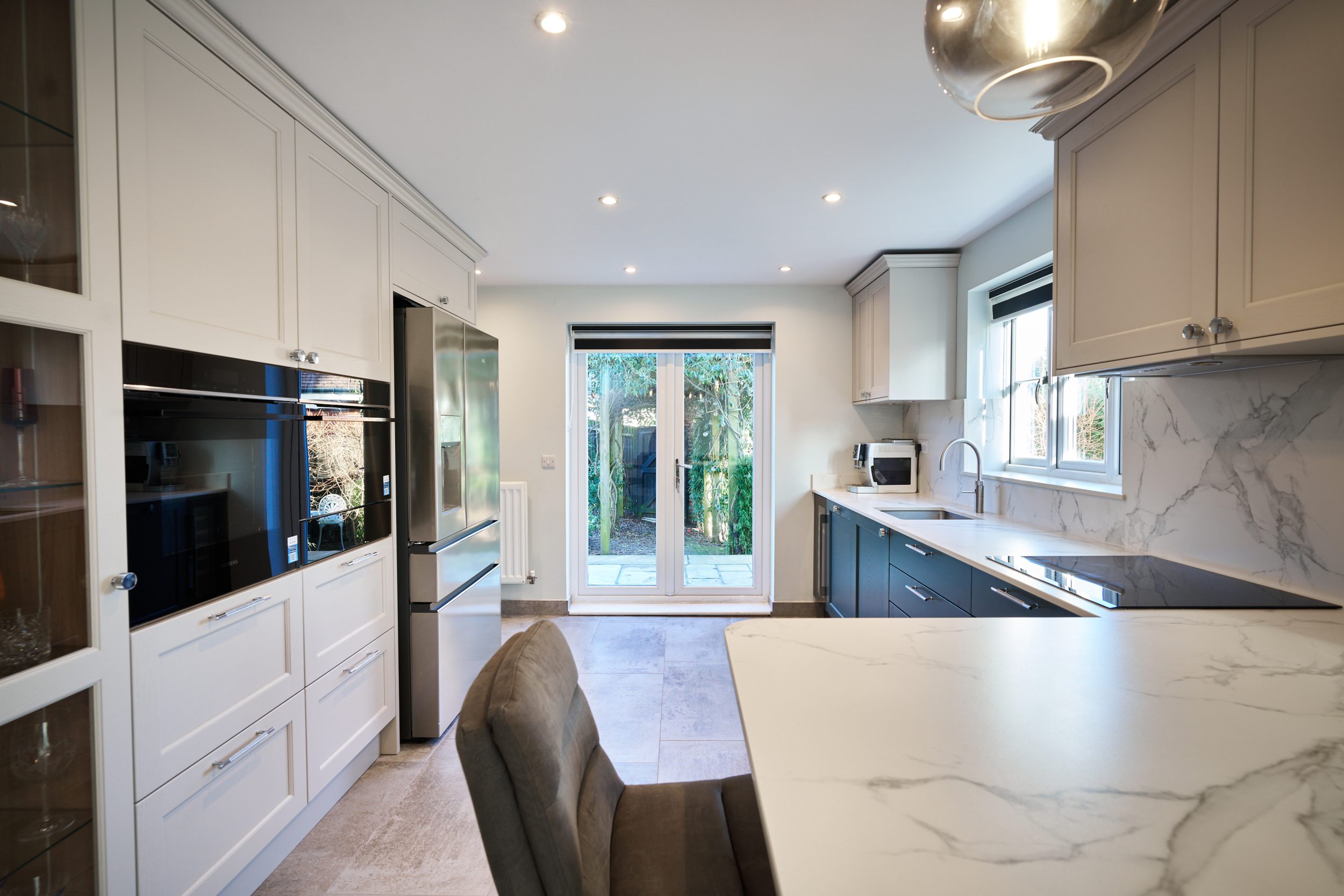 The cabinetry features a two-tone approach, with soft grey upper cabinets paired with deep blue lower cabinets, adding a sophisticated color contrast that anchors the room. The countertops and backsplash are crafted from a marble-effect quartz, which brings a luxurious yet practical surface to the kitchen, resisting stains and scratches. Storage was a high priority, leading to the inclusion of full-height cabinets and well-organized drawers that maximize usable space while keeping the counters clear. To enhance the room’s ambience, recessed ceiling lights provide even illumination, while a statement pendant light over the bar area adds visual interest and modern flair.