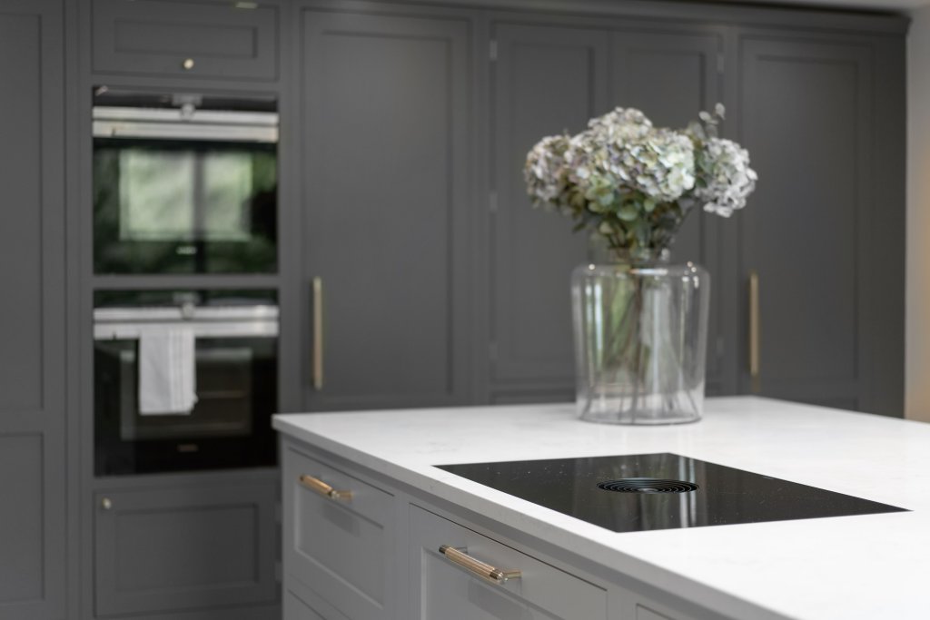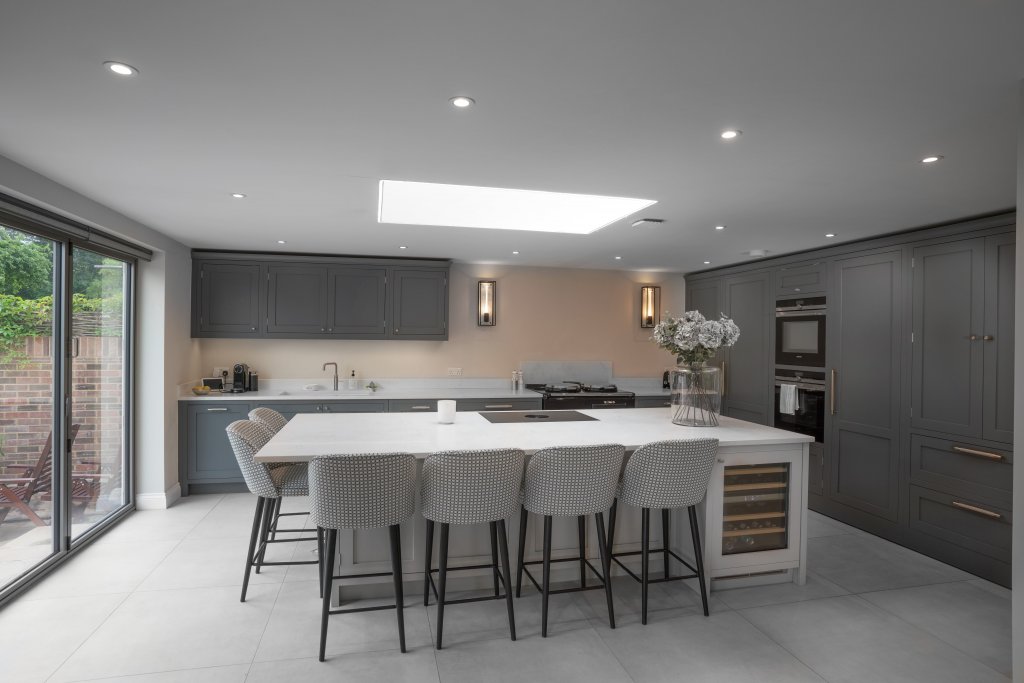Sarah wanted a design that combines classic elegance with contemporary touches, resulting in a luxurious, welcoming atmosphere. Central to her vision was an island flooded with natural light from a large skylight to create a warm, inviting ambiance. Sarah desired a carefully curated colour palette of soft and rich greys to add depth  to the space. In addition to the aesthetic, Sarah emphasised the need for functionality, requesting top-of-the-line appliances discreetly integrated into the design and bespoke cabinetry to maximise storage.